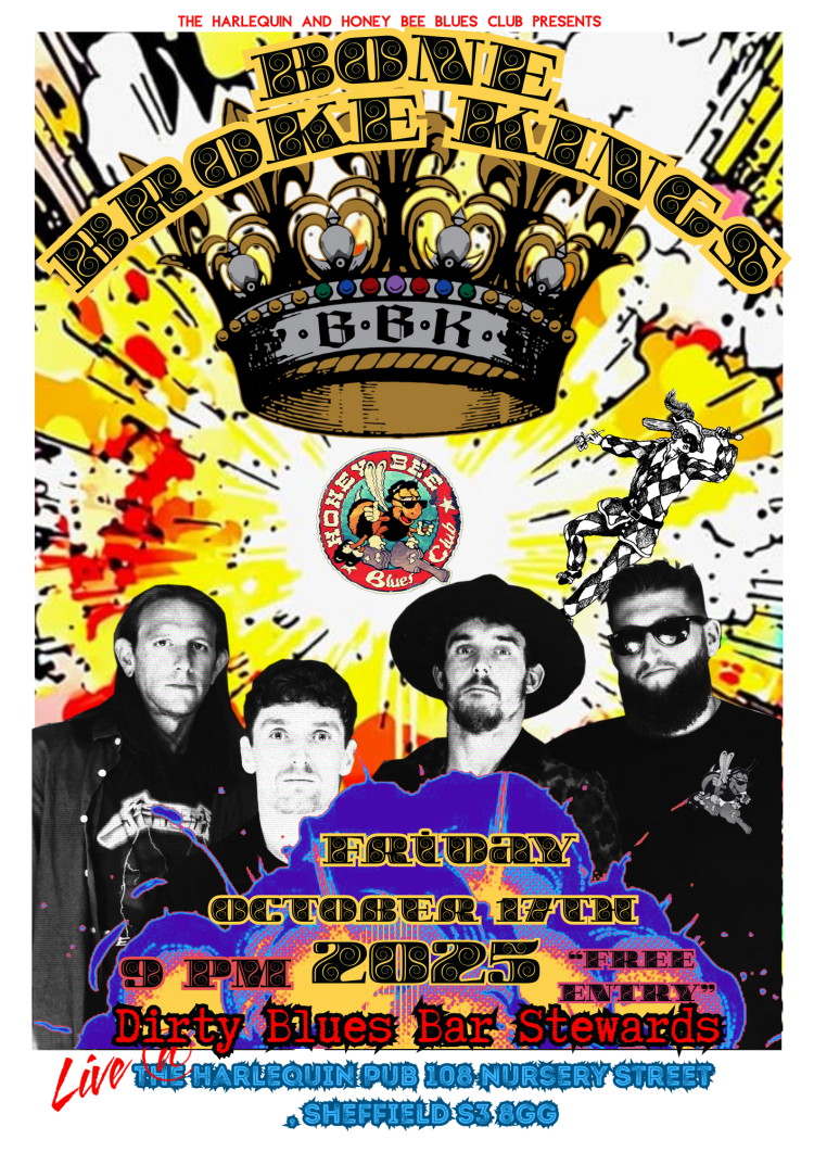 After their brilliant performance at Cleethorpes Rail and Ale Festival we’re proud to announce the Bone Broke Kings will be appearing at The Harlequin, Sheffield bowl. On October 17th. “FREE ENTRY” 9PM Kick off.And it will.See you down the front.
