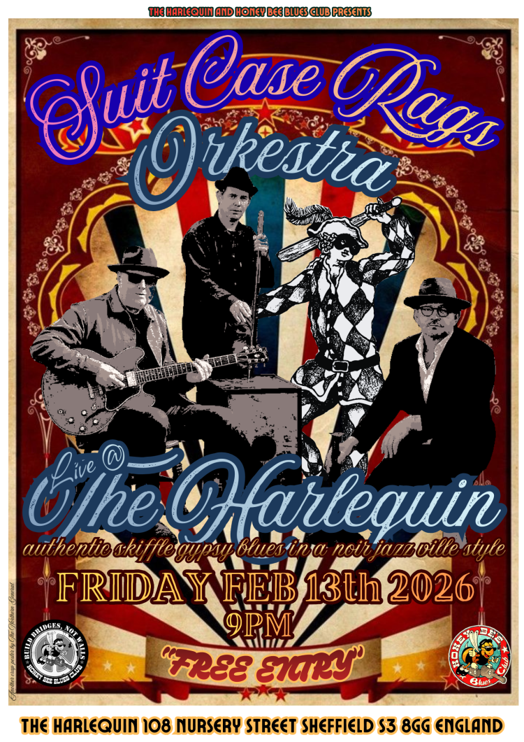 After last years brilliant performance at The Cleethorpes Ale and Rail Festival we are honoured to welcome Suitcase Rags Orkstra to The Harlequin. “A mesmerising blend of authentic skiffle gypsy blues in a noir jazz ville style.”That sentence alone should make you want to attend and check these chaps out. A solid back bone of three is no grantee on numbers as a mix of status,occasion and availability means that these chaps could materialise on stage in any form only to embellish the rich and varied sound they can produce.Really worth the effort to attend for this one as you’ll be in for a night of epic entertainment (worth it just for the tea chest bass if they decide to roll that out) All kicks off from 9PM at The Harlequin Bowl and it’s “FREE ENTRT”.